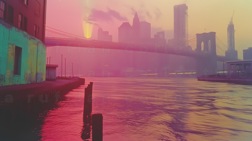 Step into a vibrant, dreamlike world with this "Retro Synthwave Cityscape" digital artwork. The scene captures a city skyline at sunset, bathed in neon hues of pink, purple, and orange. The iconic Brooklyn Bridge spans across the water, with reflections adding to the surreal atmosphere. Perfect for those who appreciate the aesthetics of the 80s and synthwave art.